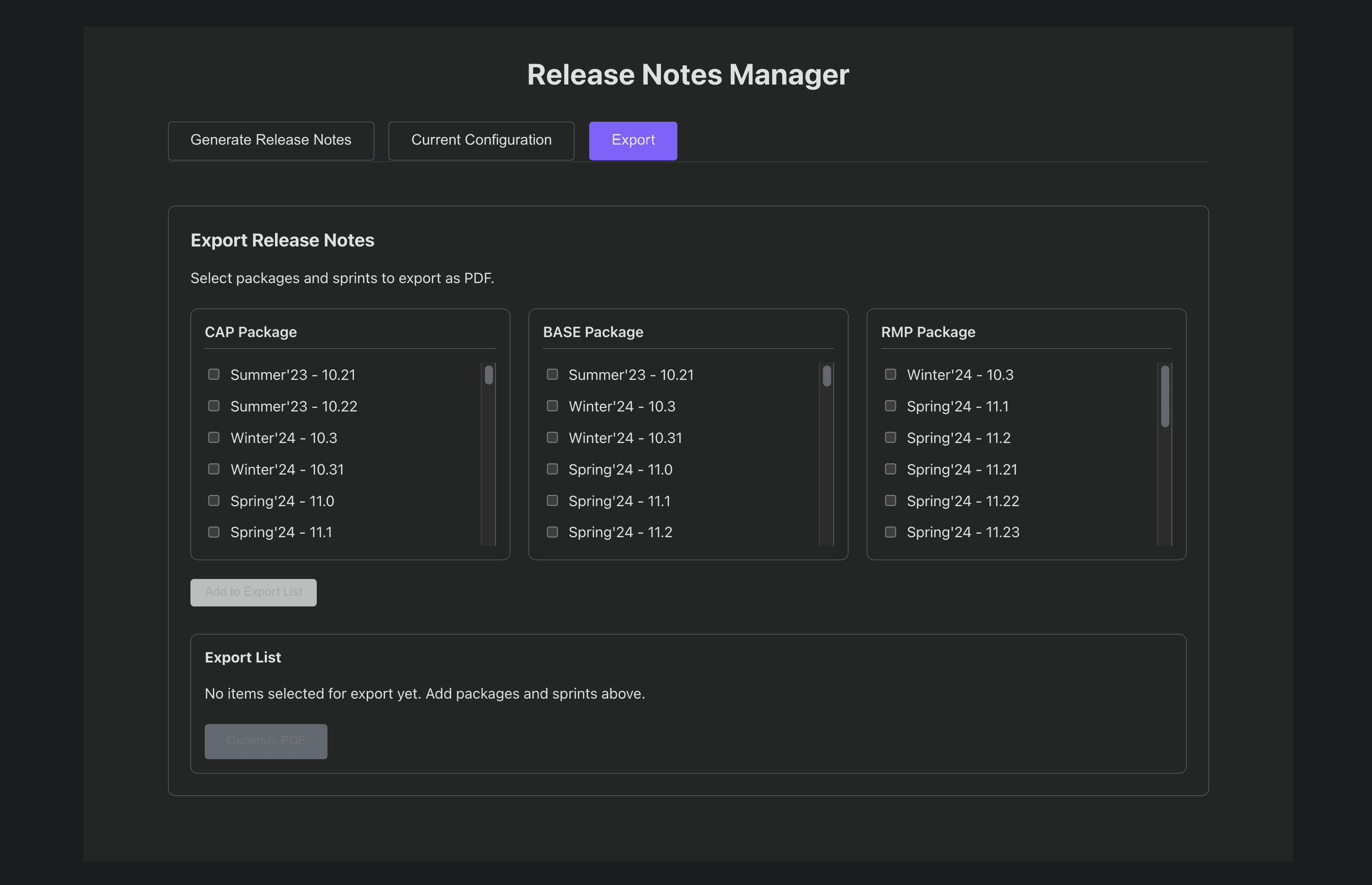 A unified, AI-powered internal tool that generates, structures, and exports release notes automatically from Jira stories and multi-package sprint data. Designed for teams struggling with inconsistent manual notes and decentralized workflows across different Salesforce-based product packages.